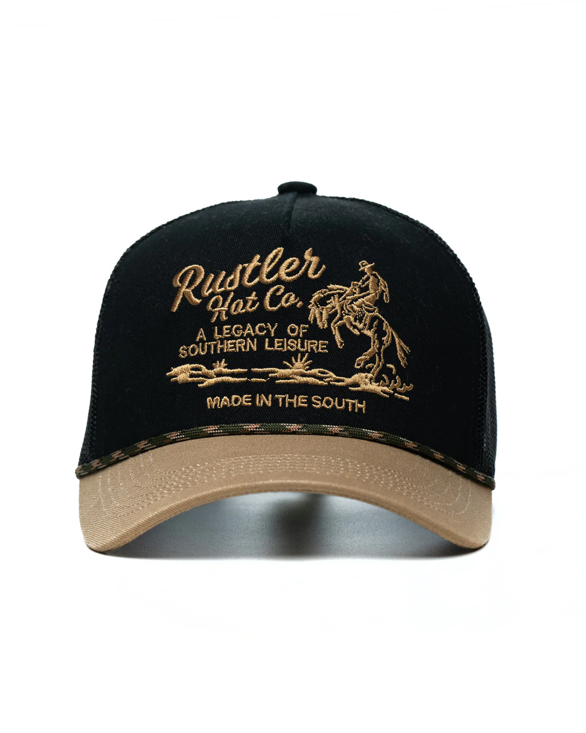 Saddle up and top off your look with this custom two-tone trucker hat, a true legacy of southern leisure. Made from durable cotton twill, it’s built to last whether you’re on the ranch or hitting the road. The Western embroidery adds rugged charm, while the unique rope detailing gives it that authentic cowboy edge. Perfect for those who ride hard, work harder, and never back down.