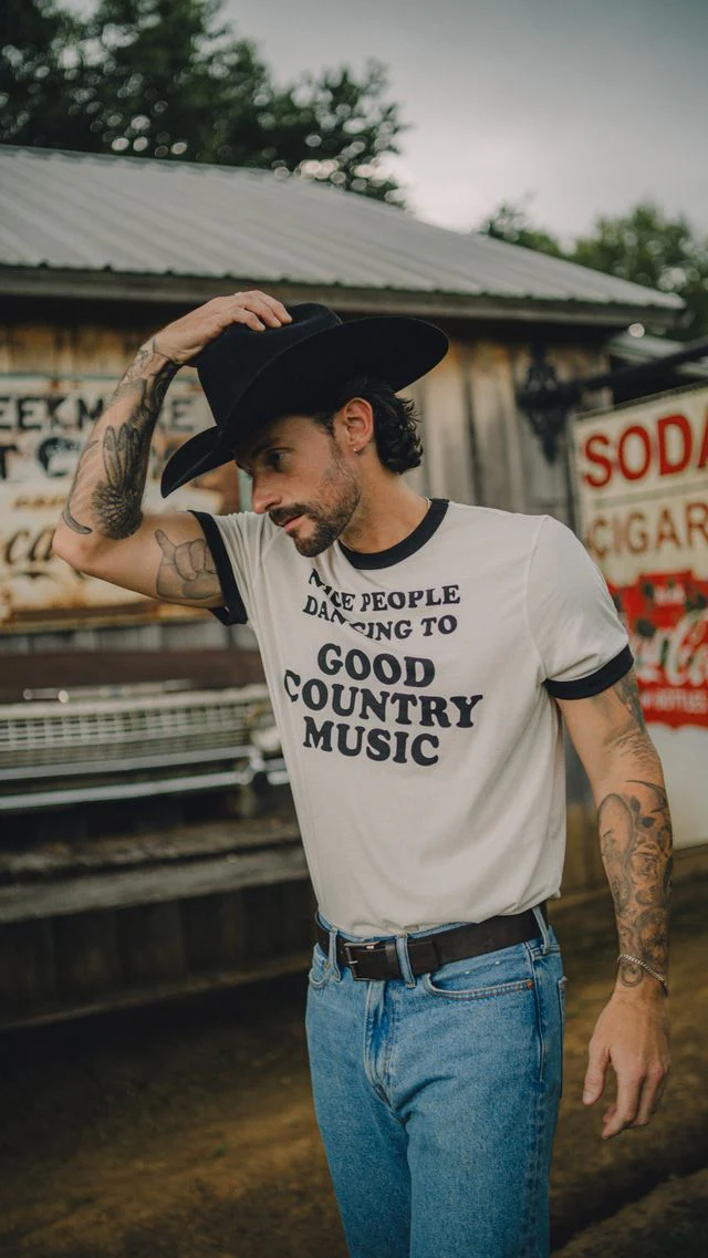 For the folks who know that good country music is best enjoyed with good company. This vintage-inspired black ringer tee features soft, breathable cotton, contrasting black trim, and a bold “Nice People Dancing to Good Country Music” graphic. Designed in collaboration with legendary Western brand H Bar C, it’s a classic fit with timeless style—perfect for concerts, honky-tonks, or just kicking back.