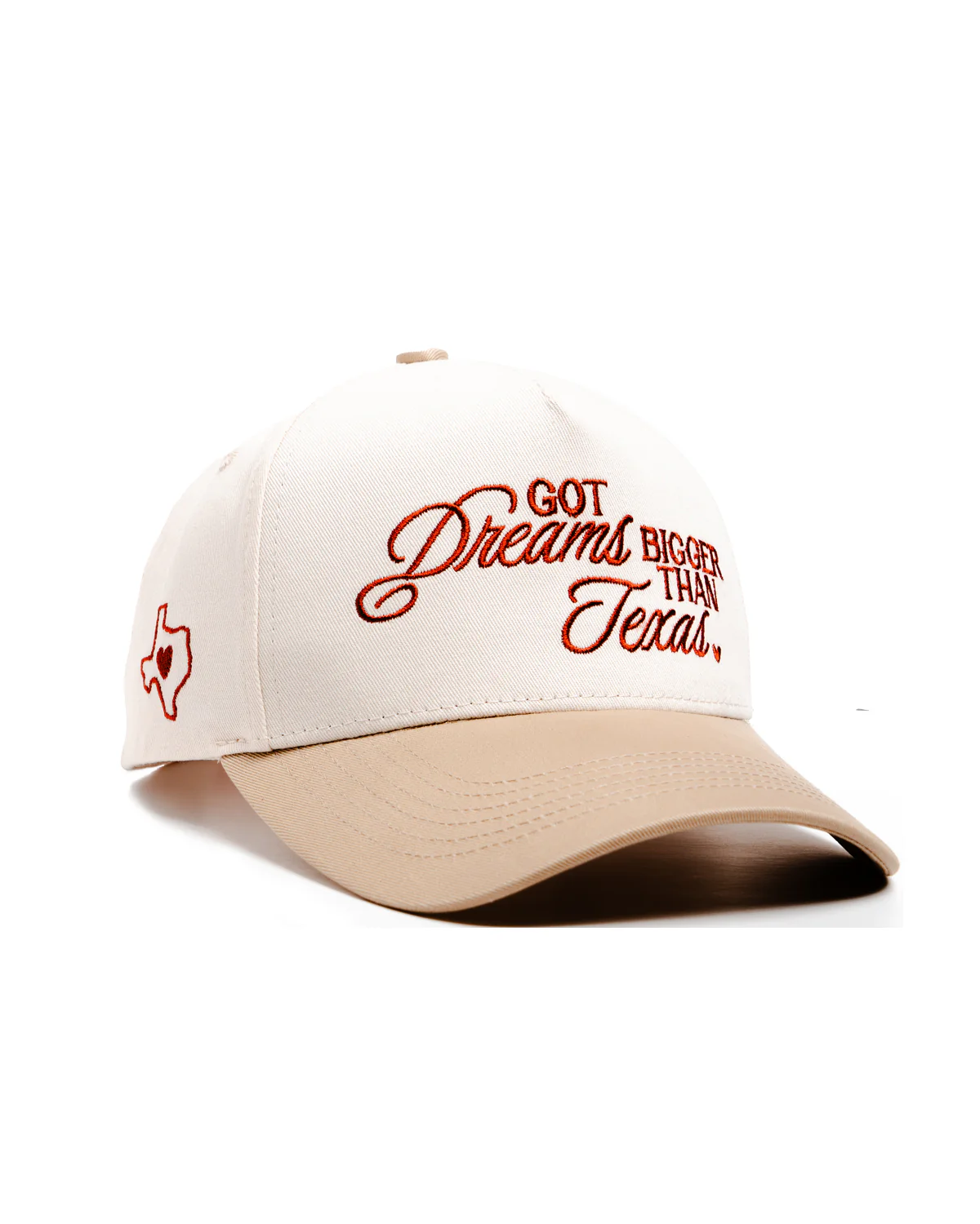 The Got Dreams Bigger Than Texas hat features cream-and-beige tones, bold red embroidery, and a Texas heart detail. Classic snapback fit with a look that works anywhere—because big dreams never go out of style.